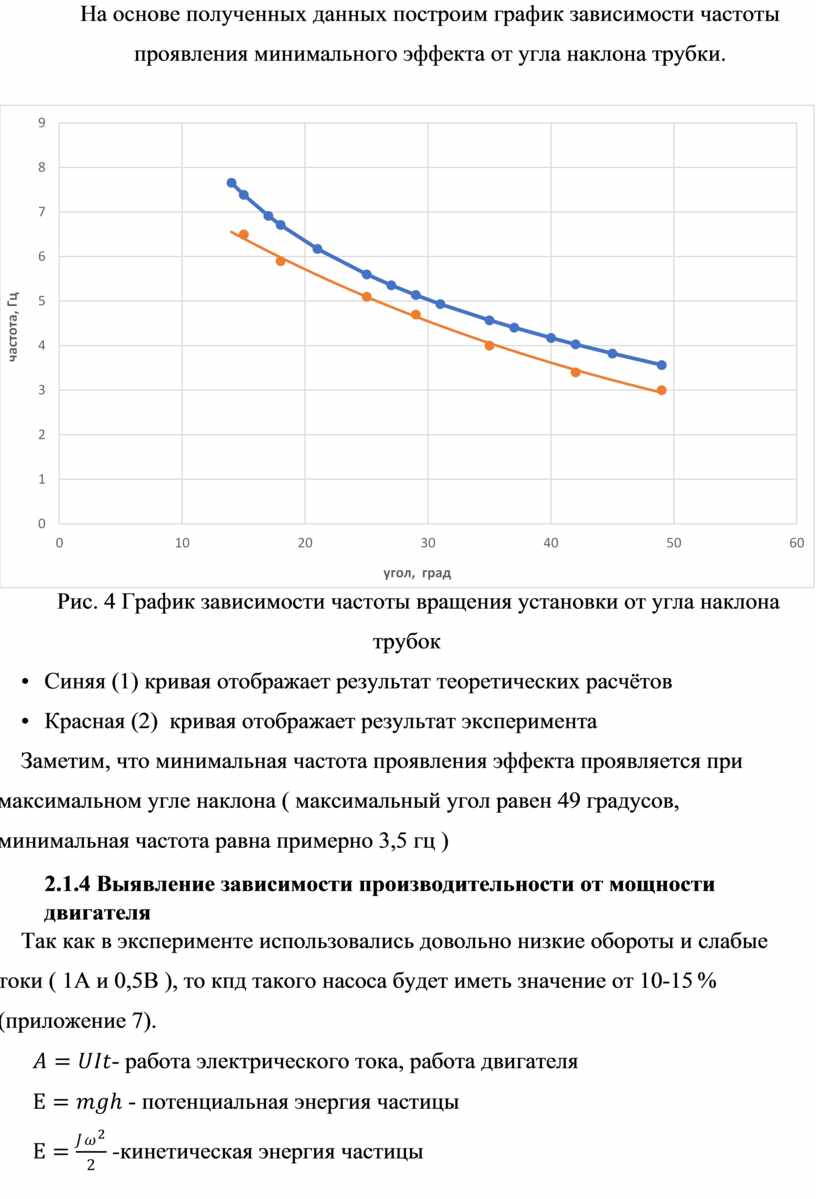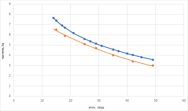 Заметим, что минимальная частота проявления эффекта проявляется при максимальном угле наклона ( максимальный угол равен 49 градусов, минимальная частота равна примерно 3,5 гц )