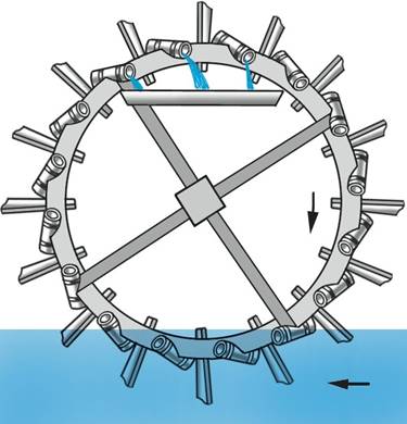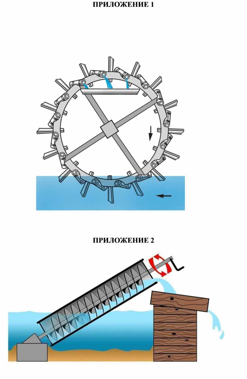 Водоподъёмные машины-этот вид устройств археологи датируют, как наиболее древний. Основой механизма было колесо, на обод которого под углом примерно в 45 градусов крепились кувшины. В нижней точке емкость набирала воду, в верхней вода выливалась в специальный желоб. Колесо вращалось физической силой — мулов, быков или человека (приложение 1).