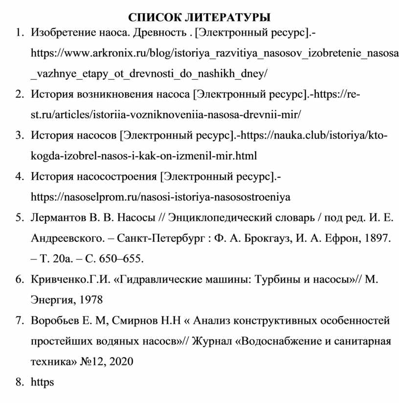 1. Изобретение наоса. Древность . [Электронный ресурс].-https://www.arkronix.ru/blog/istoriya_razvitiya_nasosov_izobretenie_nasosa_vazhnye_etapy_ot_drevnosti_do_nashikh_dney/