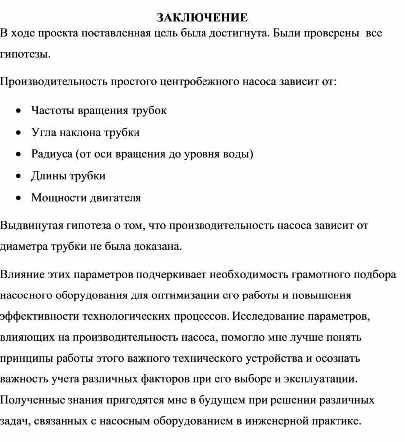 Влияние этих параметров подчеркивает необходимость грамотного подбора насосного оборудования для оптимизации его работы и повышения эффективности технологических процессов. Исследование параметров, влияющих на производительность насоса, помогло мне лучше понять принципы работы этого важного технического устройства и осознать важность учета различных факторов при его выборе и эксплуатации. Полученные знания пригодятся мне в будущем при решении различных задач, связанных с насосным оборудованием в инженерной практике.