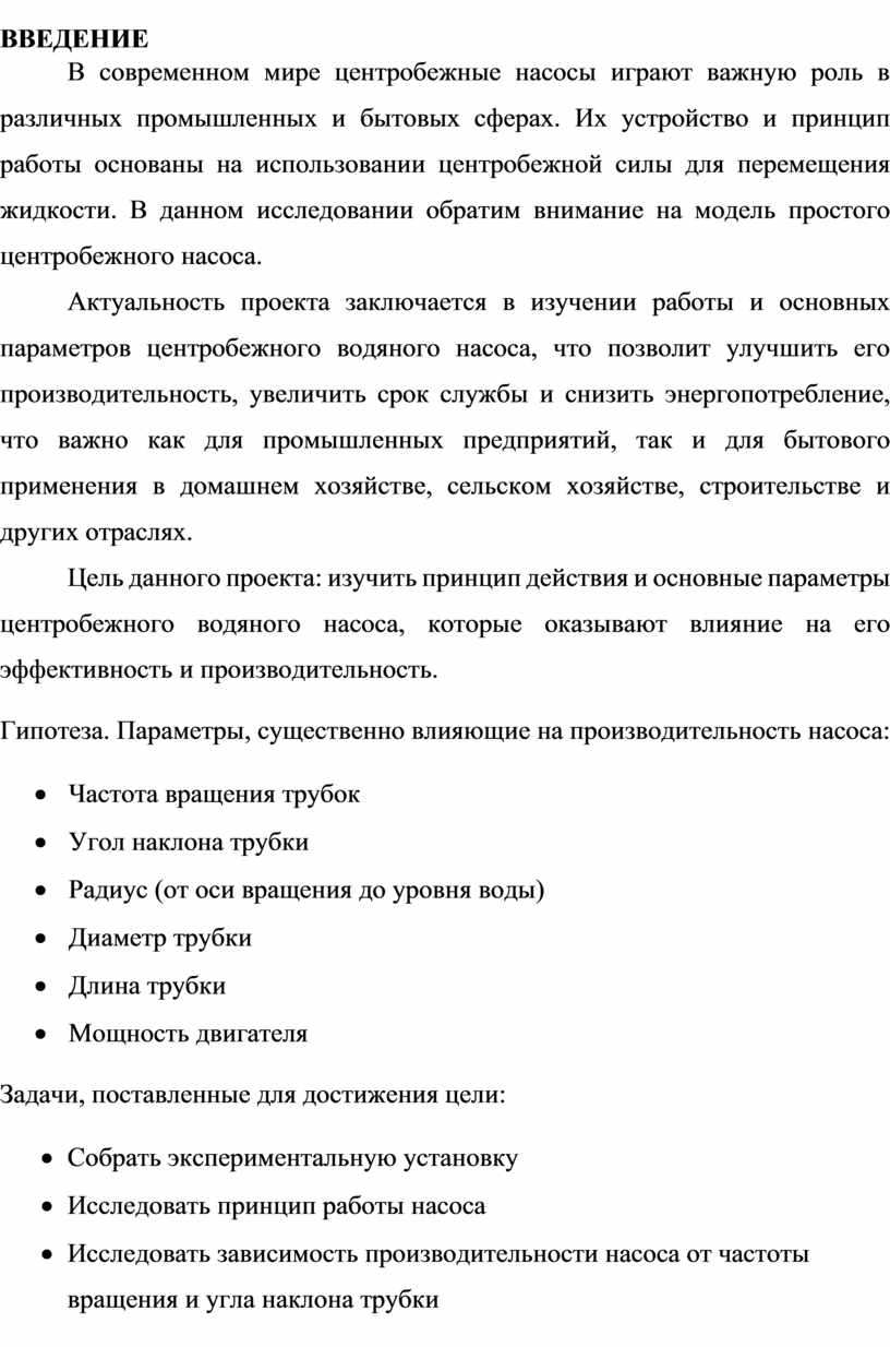 Цель данного проекта: изучить принцип действия и основные параметры центробежного водяного насоса, которые оказывают влияние на его эффективность и производительность.