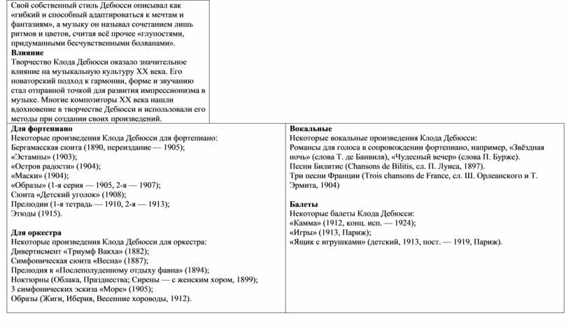 Свой собственный стиль Дебюсси описывал как «гибкий и способный адаптироваться к мечтам и фантазиям», а музыку он называл сочетанием лишь ритмов и цветов, считая всё прочее «глупостями, придуманными бесчувственными болванами». Влияние Творчество Клода Дебюсси оказало значительное влияние на музыкальную культуру XX века. Его новаторский подход к гармонии, форме и звучанию стал отправной точкой для развития импрессионизма в музыке. Многие композиторы XX века нашли вдохновение в творчестве Дебюсси и использовали его методы при создании своих произведений. |