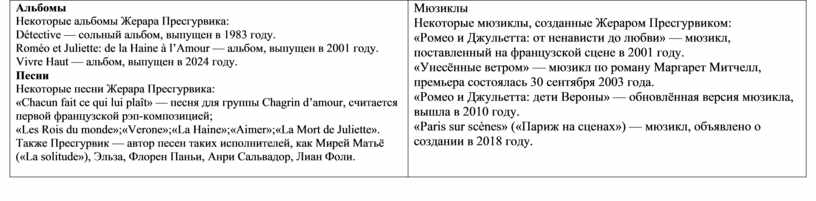 Альбомы Некоторые альбомы Жерара Пресгурвика: Détective — сольный альбом, выпущен в 1983 году. Roméo et Juliette: de la Haine à l’Amour — альбом, выпущен в 2001 году. Vivre Haut — альбом, выпущен в 2024 году. Песни Некоторые песни Жерара Пресгурвика: «Chacun fait ce qui lui plaît» — песня для группы Chagrin d’amour, считается первой французской рэп-композицией; «Les Rois du monde»;«Verone»;«La Haine»;«Aimer»;«La Mort de Juliette». Также Пресгурвик — автор песен таких исполнителей, как Мирей Матьё («La solitude»), Эльза, Флорен Паньи, Анри Сальвадор, Лиан Фоли.
