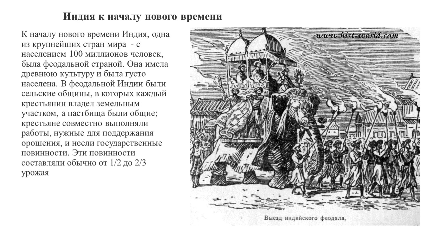 К началу нового времени Индия, одна из крупнейших стран мира - с населением 100 миллионов человек, была феодальной страной. Она имела древнюю культуру и была густо населена. В феодальной Индии были сельские общины, в которых каждый крестьянин владел земельным участком, а пастбища были общие; крестьяне совместно выполняли работы, нужные для поддержания орошения, и несли государственные повинности. Эти повинности составляли обычно от 1/2 до 2/3 урожая