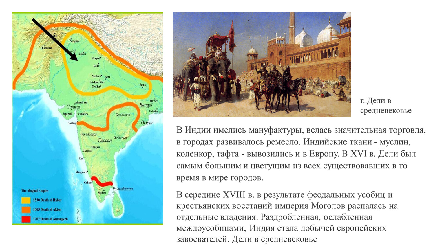 В Индии имелись мануфактуры, велась значительная торговля, в городах развивалось ремесло. Индийские ткани - муслин, коленкор, тафта - вывозились и в Европу. В XVI в. Дели был самым большим и цветущим из всех существовавших в то время в мире городов.