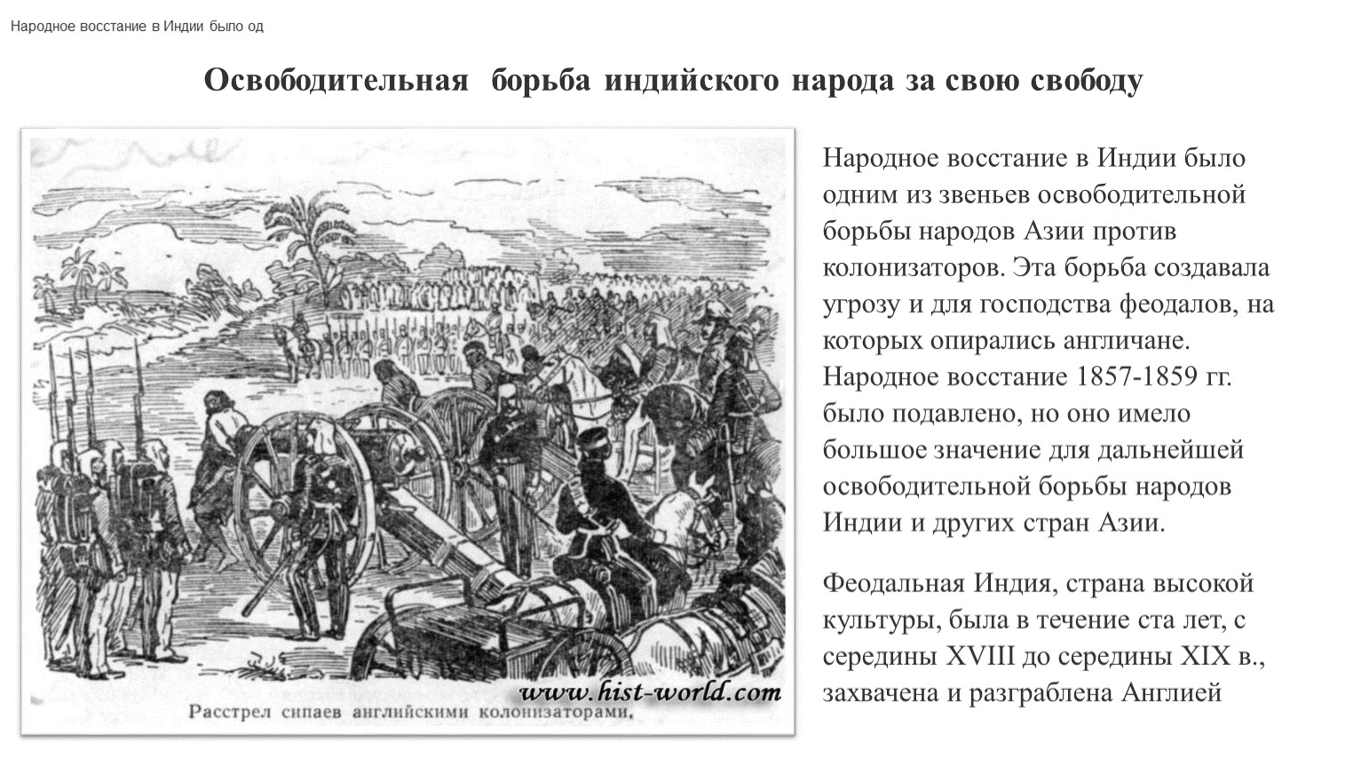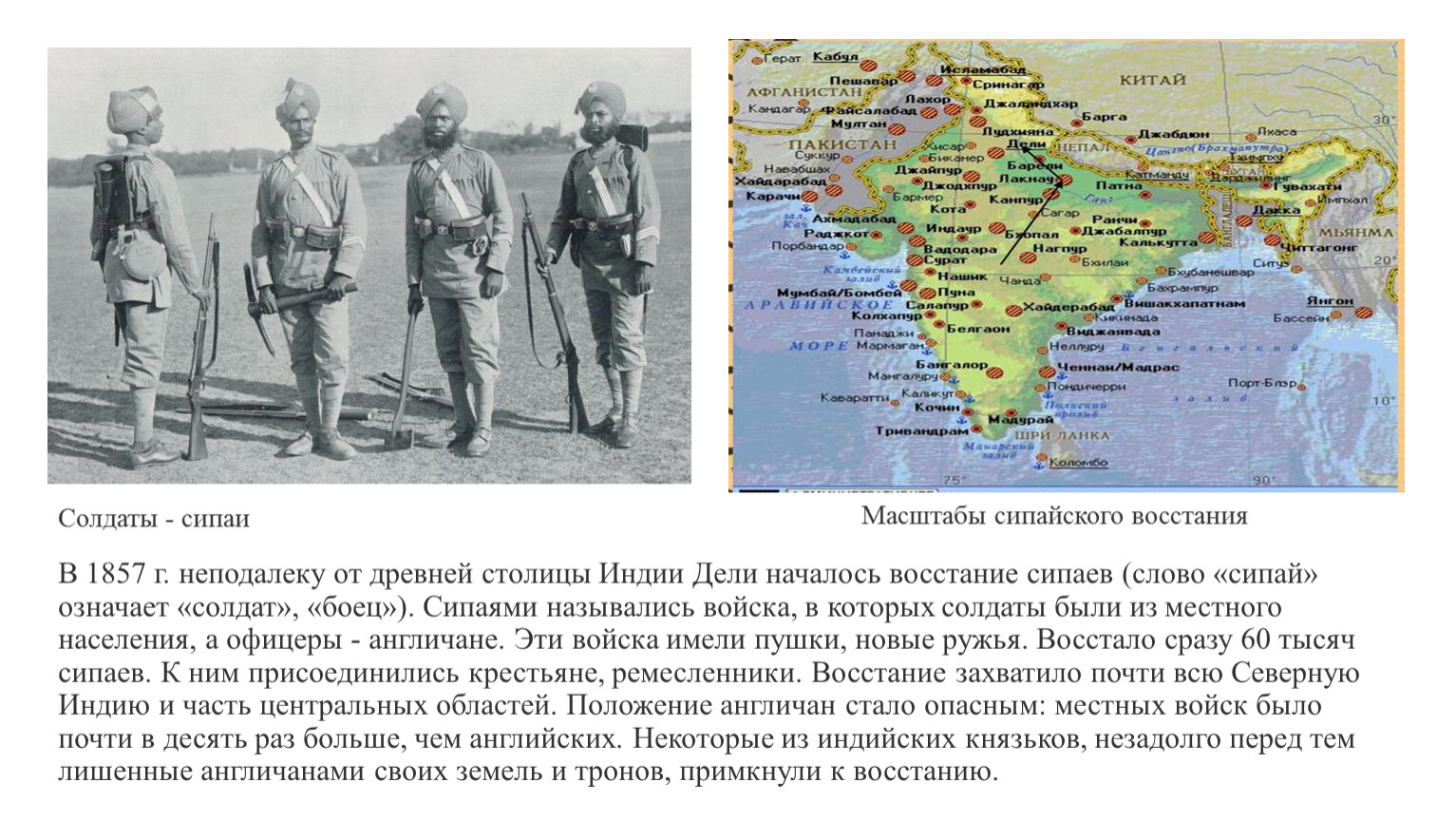 В 1857 г. неподалеку от древней столицы Индии Дели началось восстание сипаев (слово «сипай» означает «солдат», «боец»). Сипаями назывались войска, в которых солдаты были из местного населения, а офицеры - англичане. Эти войска имели пушки, новые ружья. Восстало сразу 60 тысяч сипаев. К ним присоединились крестьяне, ремесленники. Восстание захватило почти всю Северную Индию и часть центральных областей. Положение англичан стало опасным: местных войск было почти в десять раз больше, чем английских. Некоторые из индийских князьков, незадолго перед тем лишенные англичанами своих земель и тронов, примкнули к восстанию.