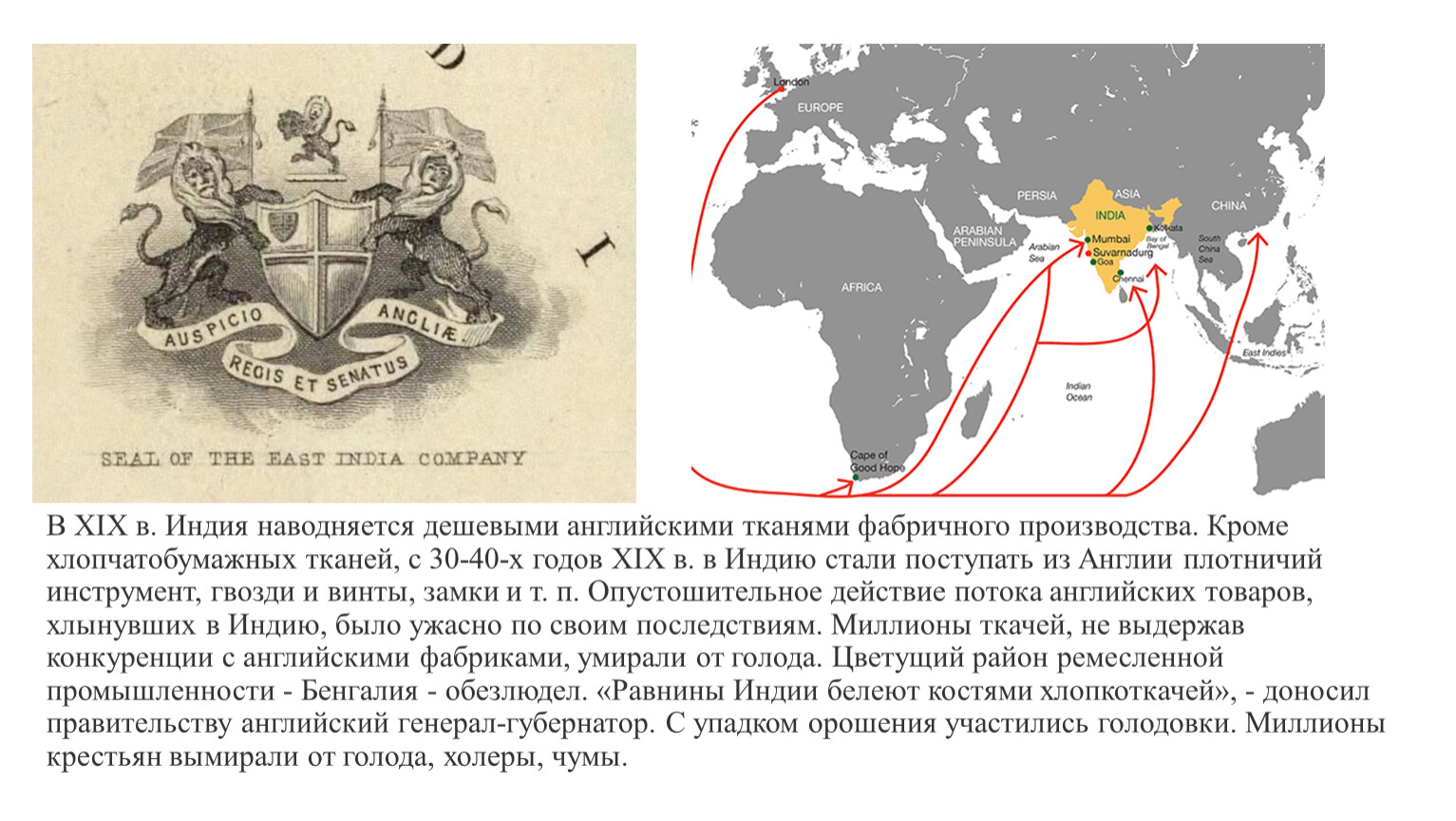 В XIX в. Индия наводняется дешевыми английскими тканями фабричного производства. Кроме хлопчатобумажных тканей, с 30-40-х годов XIX в. в Индию стали поступать из Англии плотничий инструмент, гвозди и винты, замки и т. п. Опустошительное действие потока английских товаров, хлынувших в Индию, было ужасно по своим последствиям. Миллионы ткачей, не выдержав конкуренции с английскими фабриками, умирали от голода. Цветущий район ремесленной промышленности - Бенгалия - обезлюдел. «Равнины Индии белеют костями хлопкоткачей», - доносил правительству английский генерал-губернатор. С упадком орошения участились голодовки. Миллионы крестьян вымирали от голода, холеры, чумы.