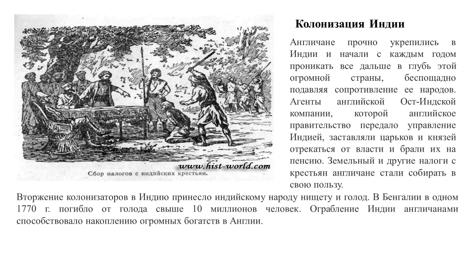 Вторжение колонизаторов в Индию принесло индийскому народу нищету и голод. В Бенгалии в одном 1770 г. погибло от голода свыше 10 миллионов человек. Ограбление Индии англичанами способствовало накоплению огромных богатств в Англии.