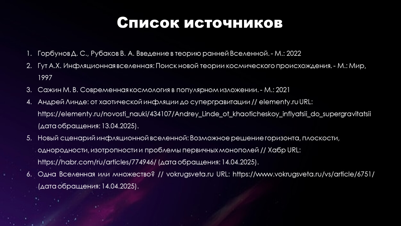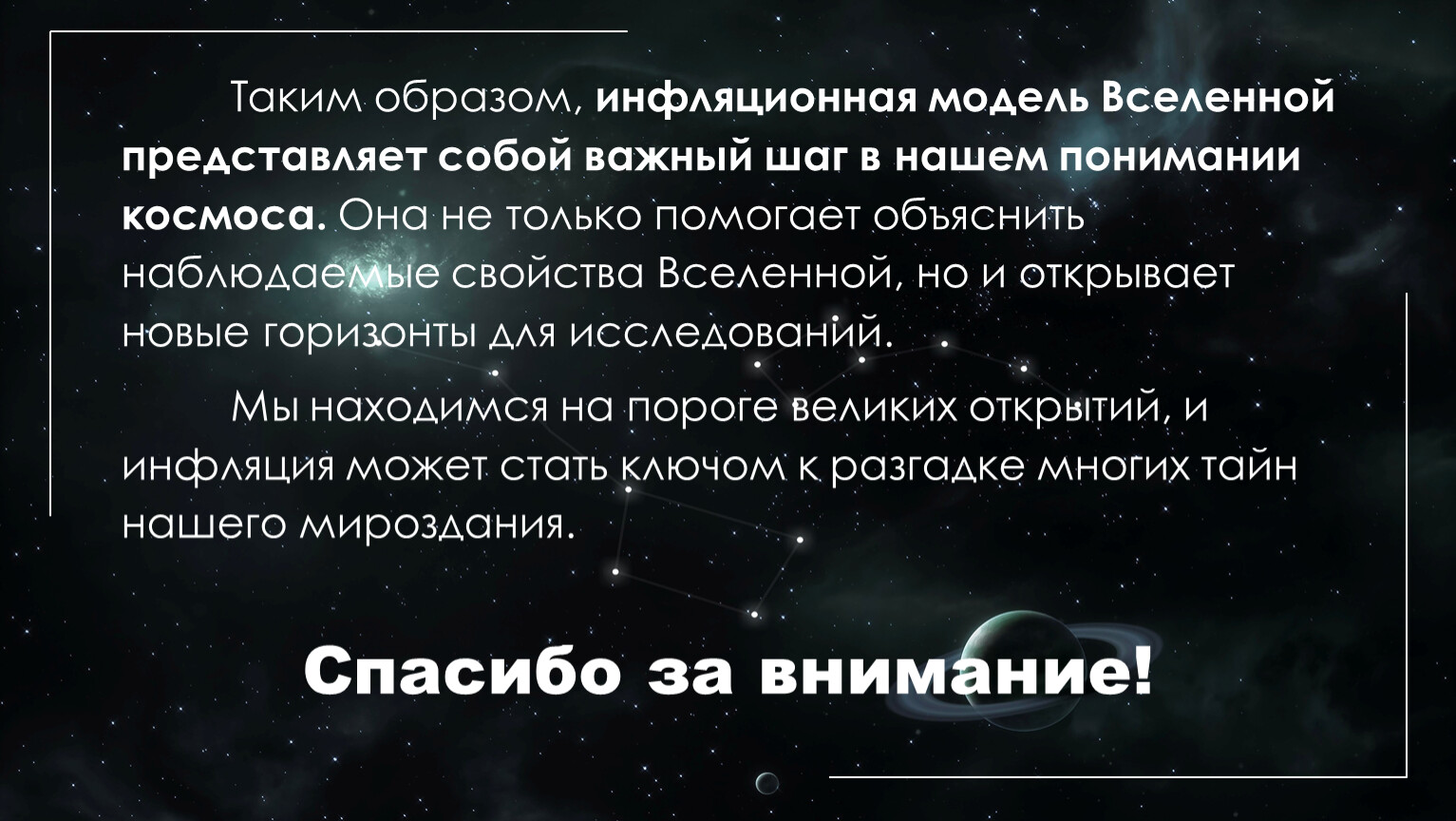 Таким образом, инфляционная модель Вселенной представляет собой важный шаг в нашем понимании космоса. Она не только помогает объяснить наблюдаемые свойства Вселенной, но и открывает новые горизонты для исследований.