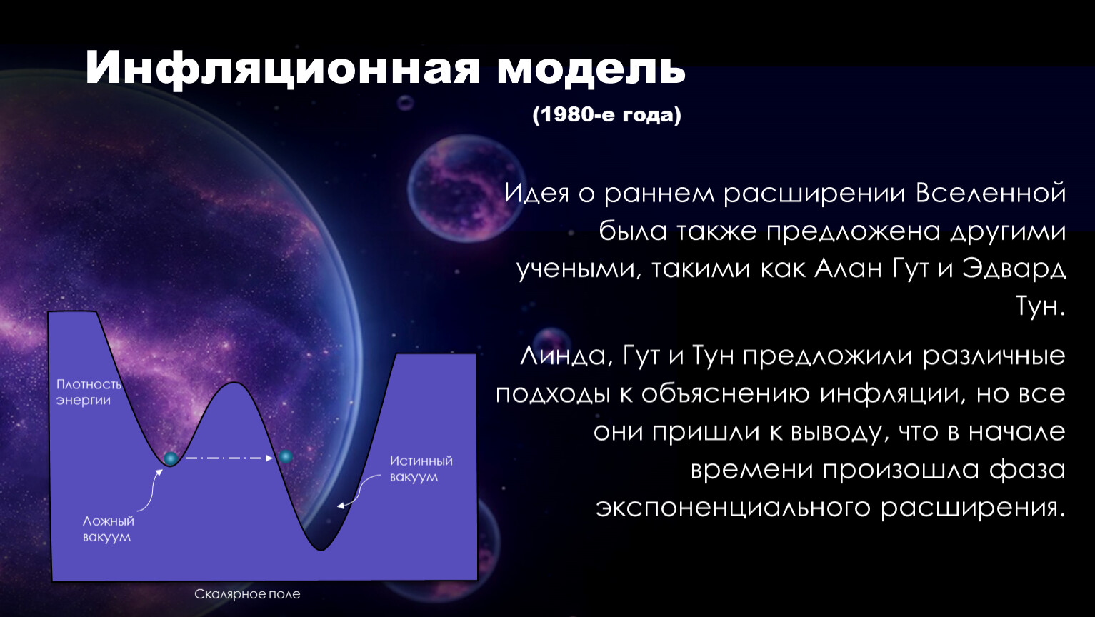 Линда, Гут и Тун предложили различные подходы к объяснению инфляции, но все они пришли к выводу, что в начале времени произошла фаза экспоненциального расширения.