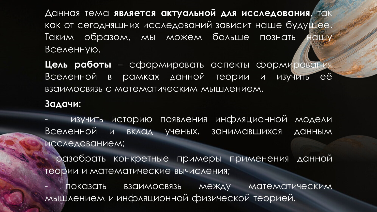 - показать взаимосвязь между математическим мышлением и инфляционной физической теорией.