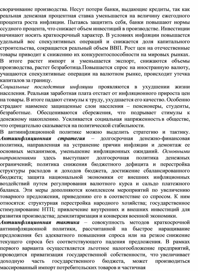 сворачивание производства. Несут потери банки, выдающие кредиты, так как реальная денежная процентная ставка уменьшается на величину ежегодного процента роста инфляции. Пытаясь защитить себя, банки повышают нормы ссудного процента, что снижает объем инвестиций в производстве. Инвестиции начинают носить краткосрочный характер. В условиях инфляции повышается удельный вес спекулятивных операций и снижается доля капитального строительства, сокращается реальный объем ВВП. Рост цен на отечественные товары приводит к снижению их конкурентоспособности на мировых рынках. В итоге растет импорт и уменьшается экспорт, снижаются объемы производства, растет безработица. Повышается спрос на иностранную валюту, учащаются спекулятивные операции на валютном рынке, происходит утечка капиталов за границу.