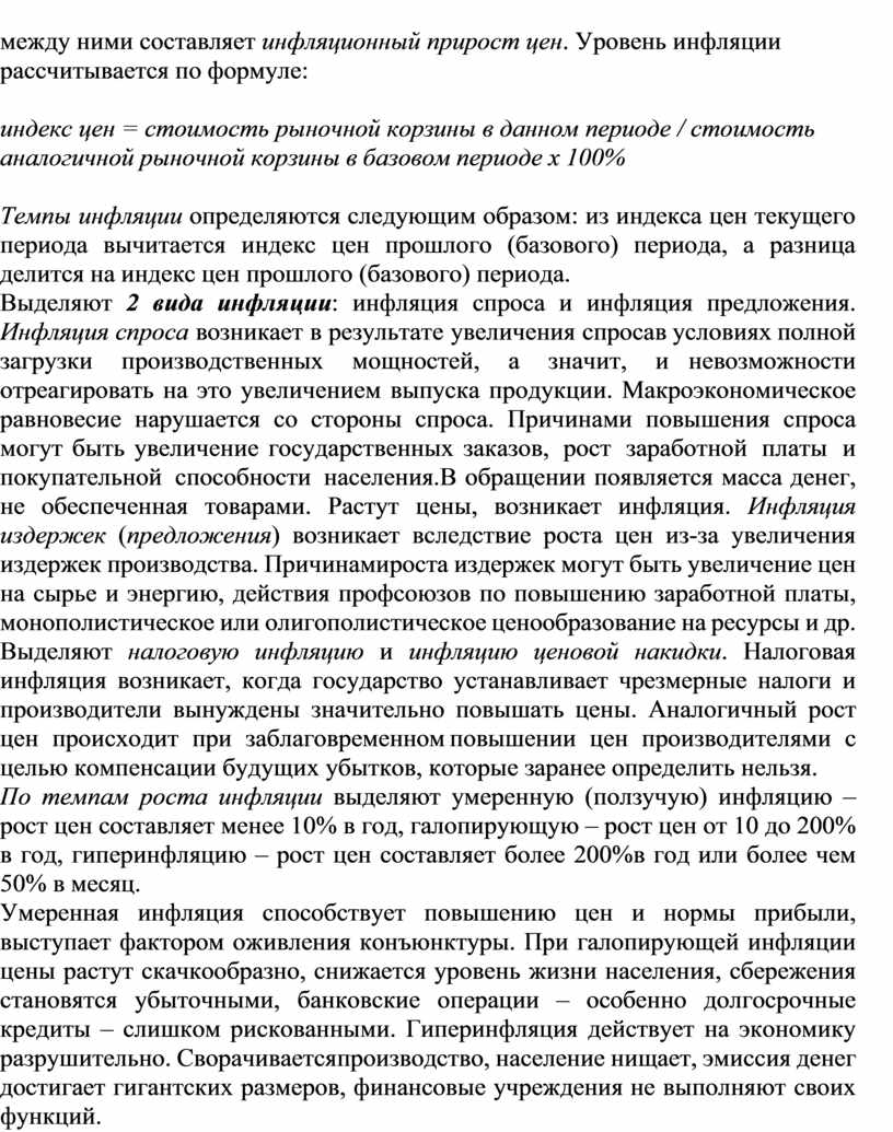 По темпам роста инфляции выделяют умеренную (ползучую) инфляцию – рост цен составляет менее 10% в год, галопирующую – рост цен от 10 до 200% в год, гиперинфляцию – рост цен составляет более 200% в год или более чем 50% в месяц.