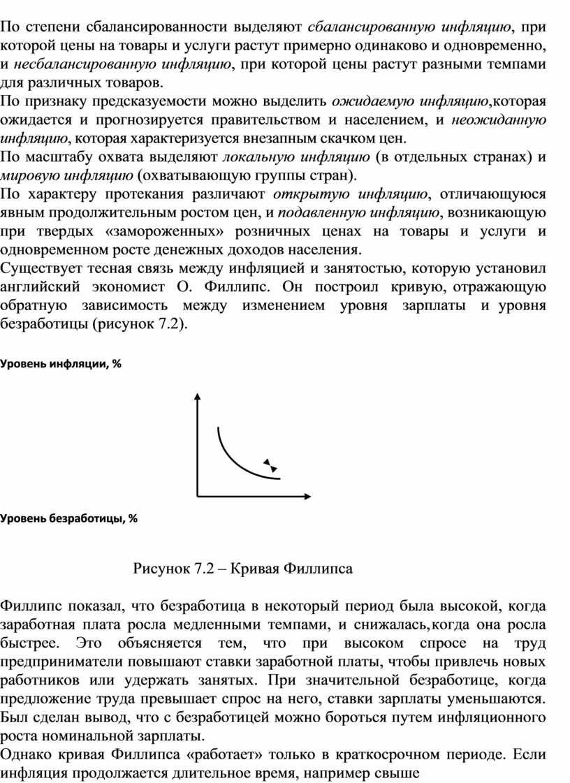 Существует тесная связь между инфляцией и занятостью, которую установил английский экономист О. Филлипс. Он построил кривую, отражающую обратную зависимость между изменением уровня зарплаты и уровня безработицы (рисунок 7.2).