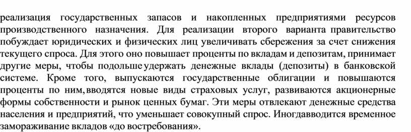 реализация государственных запасов и накопленных предприятиями ресурсов производственного назначения. Для реализации второго варианта правительство побуждает юридических и физических лиц увеличивать сбережения за счет снижения текущего спроса. Для этого оно повышает проценты по вкладам и депозитам, принимает другие меры, чтобы подольше удержать денежные вклады (депозиты) в банковской системе. Кроме того, выпускаются государственные облигации и повышаются проценты по ним, вводятся новые виды страховых услуг, развиваются акционерные формы собственности и рынок ценных бумаг. Эти меры отвлекают денежные средства населения и предприятий, что уменьшает совокупный спрос. Иногда вводится временное замораживание вкладов «до востребования».