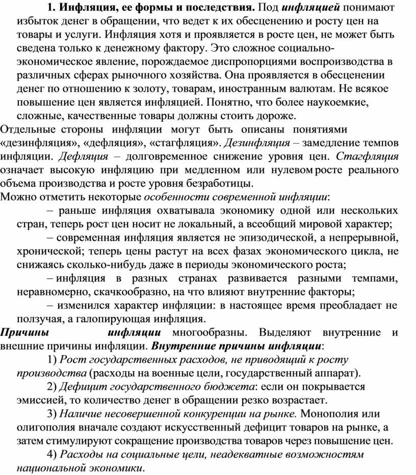 1. Инфляция, ее формы и последствия. Под инфляцией понимают избыток денег в обращении, что ведет к их обесценению и росту цен на товары и услуги. Инфляция хотя и проявляется в росте цен, не может быть сведена только к денежному фактору. Это сложное социально- экономическое явление, порождаемое диспропорциями воспроизводства в различных сферах рыночного хозяйства. Она проявляется в обесценении денег по отношению к золоту, товарам, иностранным валютам. Не всякое повышение цен является инфляцией. Понятно, что более наукоемкие, сложные, качественные товары должны стоить дороже.