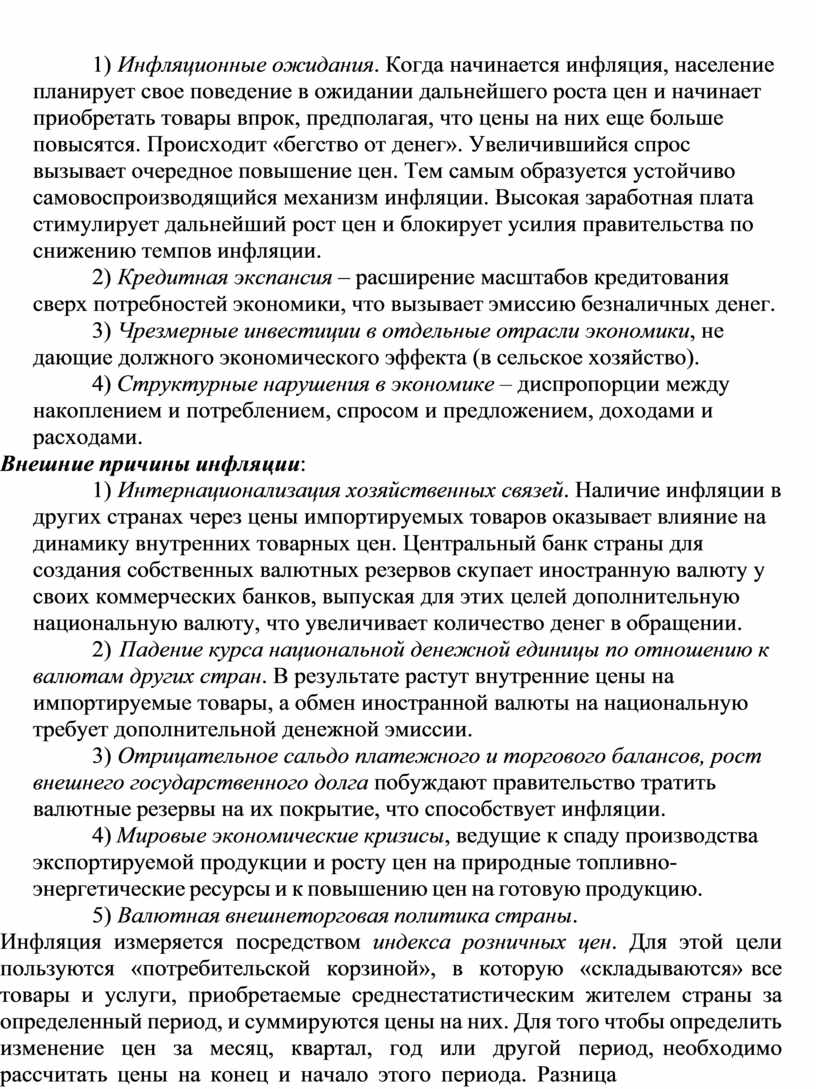 1) Интернационализация хозяйственных связей. Наличие инфляции в других странах через цены импортируемых товаров оказывает влияние на динамику внутренних товарных цен. Центральный банк страны для создания собственных валютных резервов скупает иностранную валюту у своих коммерческих банков, выпуская для этих целей дополнительную национальную валюту, что увеличивает количество денег в обращении.