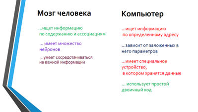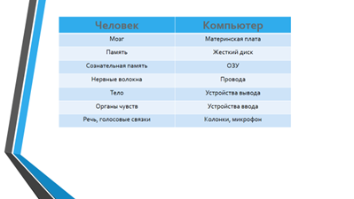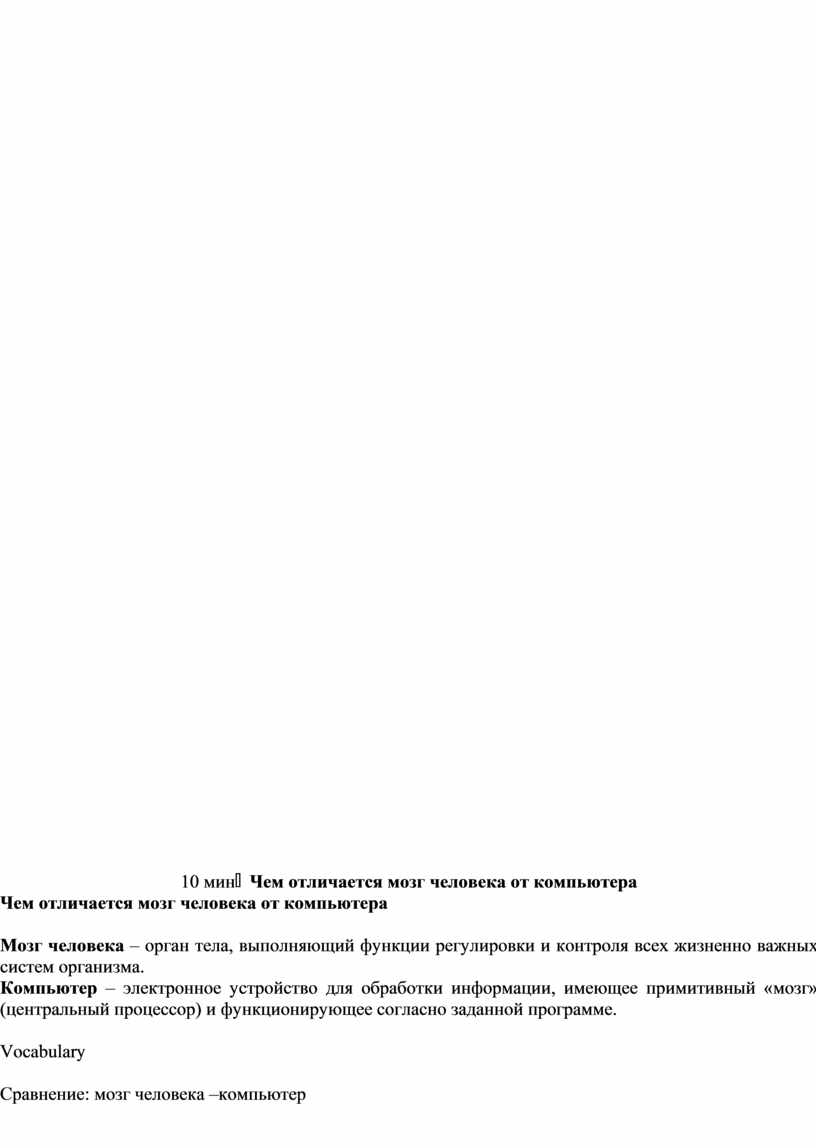 Мозг человека – орган тела, выполняющий функции регулировки и контроля всех жизненно важных систем организма. Компьютер – электронное устройство для обработки информации, имеющее примитивный «мозг» (центральный процессор) и функционирующее согласно заданной программе.