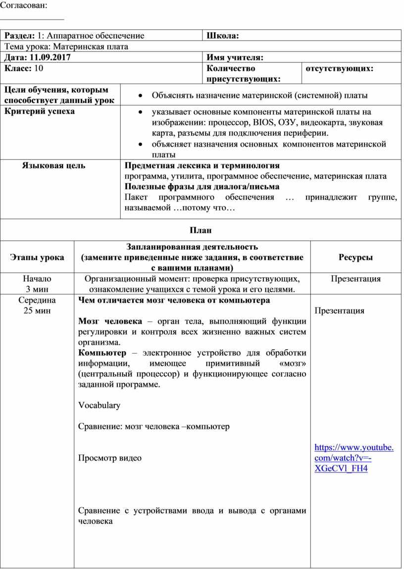 · указывает основные компоненты материнской платы на изображении: процессор, BIOS, ОЗУ, видеокарта, звуковая карта, разъемы для подключения периферии. · объясняет назначения основных компонентов материнской платы |