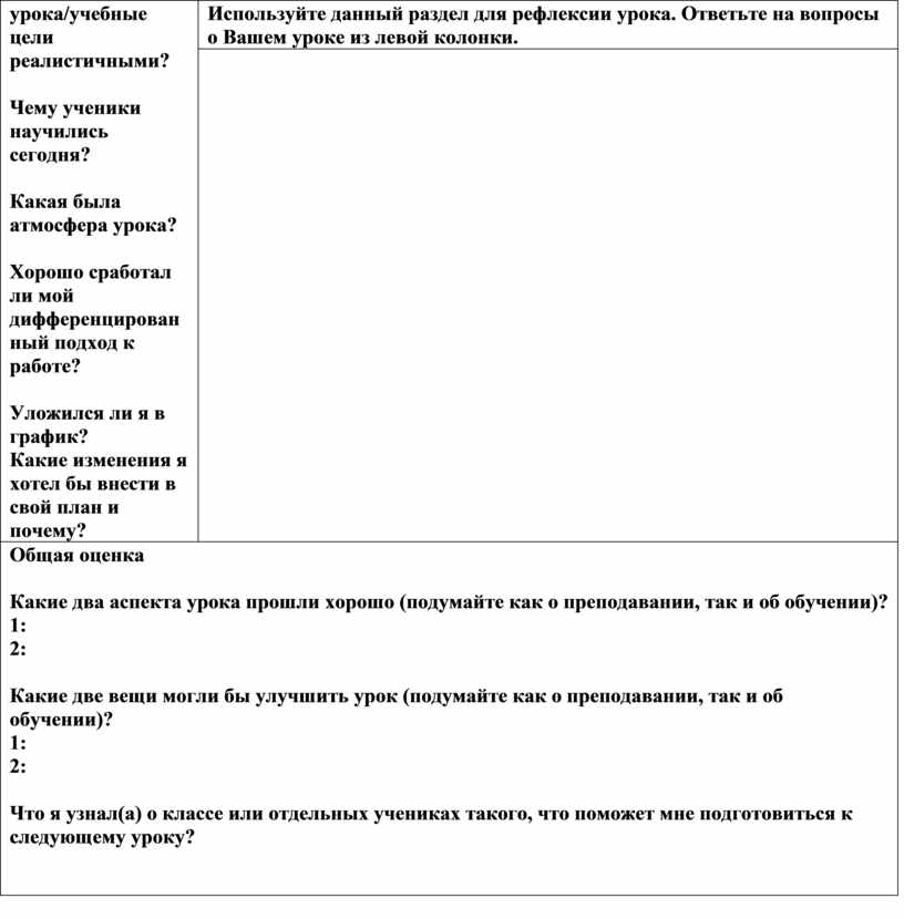 Используйте данный раздел для рефлексии урока. Ответьте на вопросы о Вашем уроке из левой колонки. |