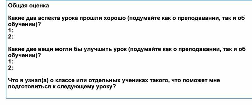Какие два аспекта урока прошли хорошо (подумайте как о преподавании, так и об обучении)? 1: 2: