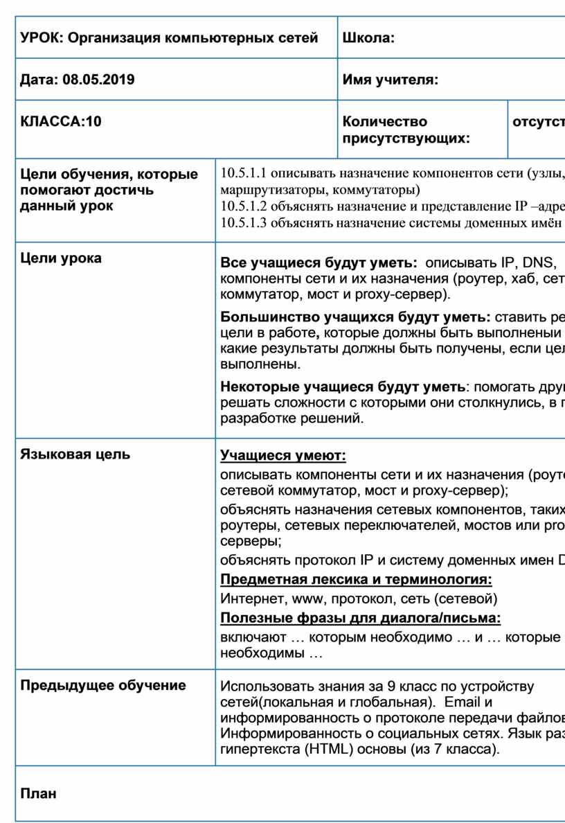 Учащиеся умеют: описывать компоненты сети и их назначения (роутер, хаб, сетевой коммутатор, мост и proxy-сервер); объяснять назначения сетевых компонентов, таких как роутеры, сетевых переключателей, мостов или proxy-серверы; объяснять протокол IP и систему доменных имен DNS Предметная лексика и терминология: Интернет, www, протокол, сеть (сетевой) Полезные фразы для диалога/письма: включают … которым необходимо … и … которые необходимы … |