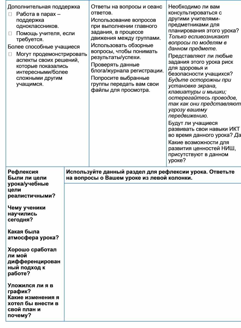 Необходимо ли вам консультироваться с другими учителями-предметниками для планирования этого урока? Только есливозникают вопросы по моделям в данном предмете. Представляют ли любые задания этого урока риск для здоровья и безопасности учащихся? Будьте осторожны при установке экрана, клавиатуры и мышки; остерегайтесь проводов, так как они представляют угрозу вашему передвижению. Будут ли учащиеся развивать свои навыки ИКТ во время данного урока? Да Какие возможности для развития ценностей НИШ, присутствуют в данном уроке? |