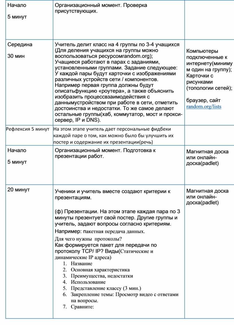 (ф) Презентации. На этом этапе каждая пара по 3 минуты презентует свой постер. Другие группы и учитель, задают вопросы согласно критериям. Например: пакетная передача данных. Для чего нужны протоколы? Как формируется пакет для передачи по протоколу TCP/ IP? Виды(Cтатические и динамические IP адреса) 1. Название 2. Основная характеристика 3. Преимущества, недостатки 4. Использование 5. Представление классу (3 мин.) 6. Закрепление темы: Просмотр видео с ответами на вопросы. 7. Сравните: |