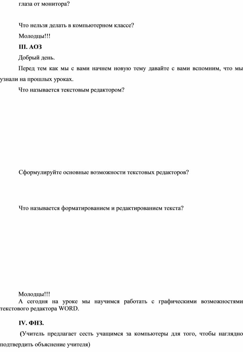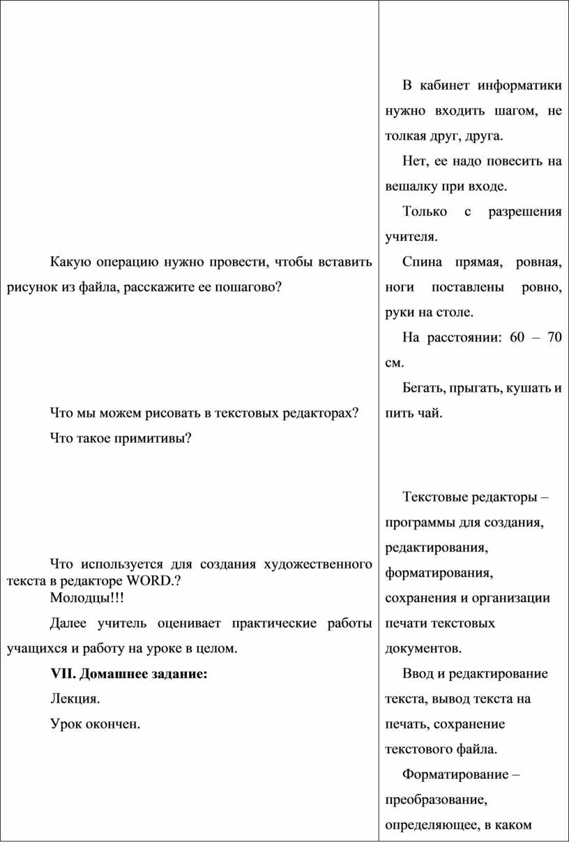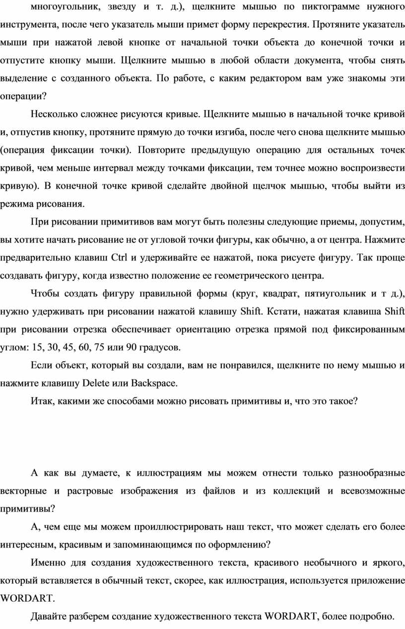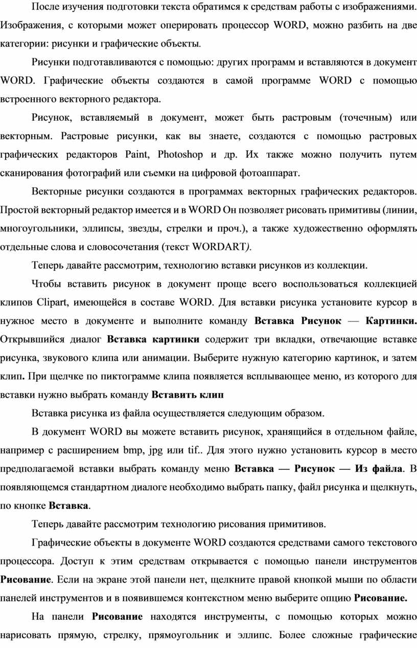 IV. ФНЗ. (Учитель предлагает сесть учащимся за компьютеры для того, чтобы наглядно подтвердить объяснение учителя) После изучения подготовки текста обратимся к средствам работы с изображениями. Изображения, с которыми может оперировать процессор WORD, можно разбить на две категории: рисунки и графические объекты. Рисунки подготавливаются с помощью: других программ и вставляются в документ WORD. Графические объекты создаются в самой программе WORD с помощью встроенного векторного редактора. Рисунок, вставляемый в документ, может быть растровым (точечным) или векторным. Растровые рисунки, как вы знаете, создаются с помощью растровых графических редакторов Paint, Photoshop и др. Их также можно получить путем сканирования фотографий или съемки на цифровой фотоаппарат. Векторные рисунки создаются в программах векторных графических редакторов. Простой векторный редактор имеется и в WORD Он позволяет рисовать примитивы (линии, многоугольники, эллипсы, звезды, стрелки и проч.), а также художественно оформлять отдельные слова и словосочетания (текст WORDART). Теперь давайте рассмотрим, технологию вставки рисунков из коллекции. Чтобы вставить рисунок в документ проще всего воспользоваться коллекцией клипов Clipart, имеющейся в составе WORD. Для вставки рисунка установите курсор в нужное место в документе и выполните команду Вставка Рисунок — Картинки. Открывшийся диалог Вставка картинки содержит три вкладки, отвечающие вставке рисунка, звукового клипа или анимации. Выберите нужную категорию картинок, и затем клип. При щелчке по пиктограмме клипа появляется всплывающее меню, из которого для вставки нужно выбрать команду Вставить клип Вставка рисунка из файла осуществляется следующим образом. В документ WORD вы можете вставить рисунок, хранящийся в отдельном файле, например с расширением bmp, jpg или tif.. Для этого нужно установить курсор в место предполагаемой вставки выбрать команду меню Вставка — Рисунок — Из файла. В появляющемся стандартном диалоге необходимо выбрать папку, файл рисунка и щелкнуть, по кнопке Вставка. Теперь давайте рассмотрим технологию рисования примитивов. Графические объекты в документе WORD создаются средствами самого текстового процессора. Доступ к этим средствам открывается с помощью панели инструментов Рисование. Если на экране этой панели нет, щелкните правой кнопкой мыши по области панелей инструментов и в появившемся контекстном меню выберите опцию Рисование. На панели Рисование находятся инструменты, с помощью которых можно нарисовать прямую, стрелку, прямоугольник и эллипс. Более сложные графические объекты создаются с помощью опции Автофигуры. Щелкните мышью по этой пиктограмме и выберите в выпадающем меню, например, пункт Линии. Вы увидите палитру инструментов: Двусторонняя стрелка, Кривая, Полилиния, Рисованная кривая. Назначение большинства этих инструментов очевидно из их названий. Инструмент Кривая используется для рисования кривых с повышенной точностью, инструмент Полилиния — для получения ломаной линии, а инструмент Рисованная линия — для имитации рисования карандашом. Следующая палитра инструментов - Основные фигуры. С ее помощью вы можете создавать готовые фигуры, начиная от параллелограмма и кончая фигурными скобками. Разверните остальные палитры инструментов рисования и познакомьтесь с их сод