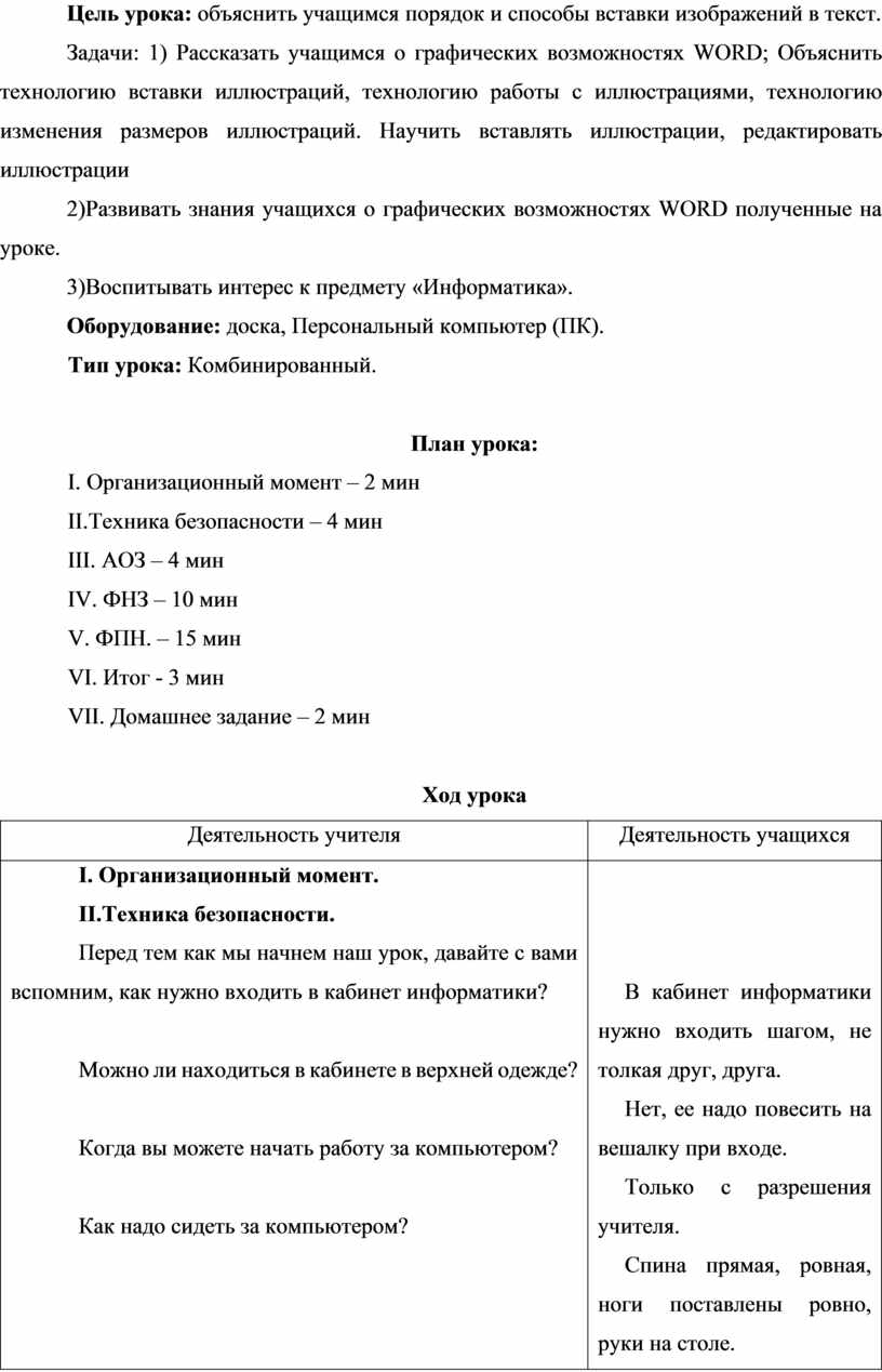 Задачи: 1) Рассказать учащимся о графических возможностях WORD; Объяснить технологию вставки иллюстраций, технологию работы с иллюстрациями, технологию изменения размеров иллюстраций. Научить вставлять иллюстрации, редактировать иллюстрации