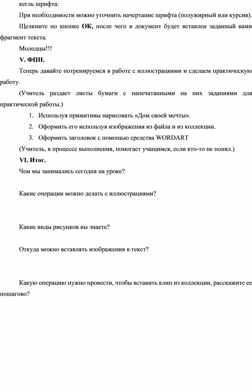 А как вы думаете, к иллюстрациям мы можем отнести только разнообразные векторные и растровые изображения из файлов и из коллекций и всевозможные примитивы? А, чем еще мы можем проиллюстрировать наш текст, что может сделать его более интересным, красивым и запоминающимся по оформлению? Именно для создания художественного текста, красивого необычного и яркого, который вставляется в обычный текст, скорее, как иллюстрация, используется приложение WORDART. Давайте разберем создание художественного текста WORDART, более подробно. WORDART позволяет задавать различные варианты оформления текстовых фрагментов. Я имею в виду наклоненный, повернутый и растянутый текст, а также текст с тенью и текст, вписанный в определенные фигуры. Варианты оформления будут выбираться нами из набора предложенных в WORD шаблонов. Для создания текста WORDART выполните следующее: Щелкните мышью по странице документа, на которой должен располагаться текст WORDART Выберите команду меню Вставка — Рисунок — объект WORDART либо щелкните по кнопке Добавить объект WORDART на панели инструментов Рисование. В открывшемся диалоге Коллекция WORDART выдели щелчком мыши нужный вариант оформления текста и нажми кнопку ОК. В следующем диалоге Изменение текста WORDART в поле Текст надписи введите текст, который хотите, художествен оформить. В полях Шрифт и Размер задайте гарнитуру и кегль шрифта: При необходимости можно уточнить начертание шрифта (полужирный или курсив). Щелкните по кнопке ОК, после чего в документ будет вставлен заданный вами фрагмент текста. Молодцы!!! V. ФПН. Теперь давайте потренируемся в работе с иллюстрациями и сделаем практическую работу. (Учитель раздает листы бумаги с напечатанными на них заданиями для практической работы.) 1. Используя примитивы нарисовать «Дом своей мечты». 2. Оформить его используя изображения из файла и из коллекции. 3. Оформить заголовок с помощью средства WORDART (Учитель, в процессе выполнения, помогает учащимся, если кто-то не понял.) VI. Итог. Чем мы занимались сегодня на уроке?