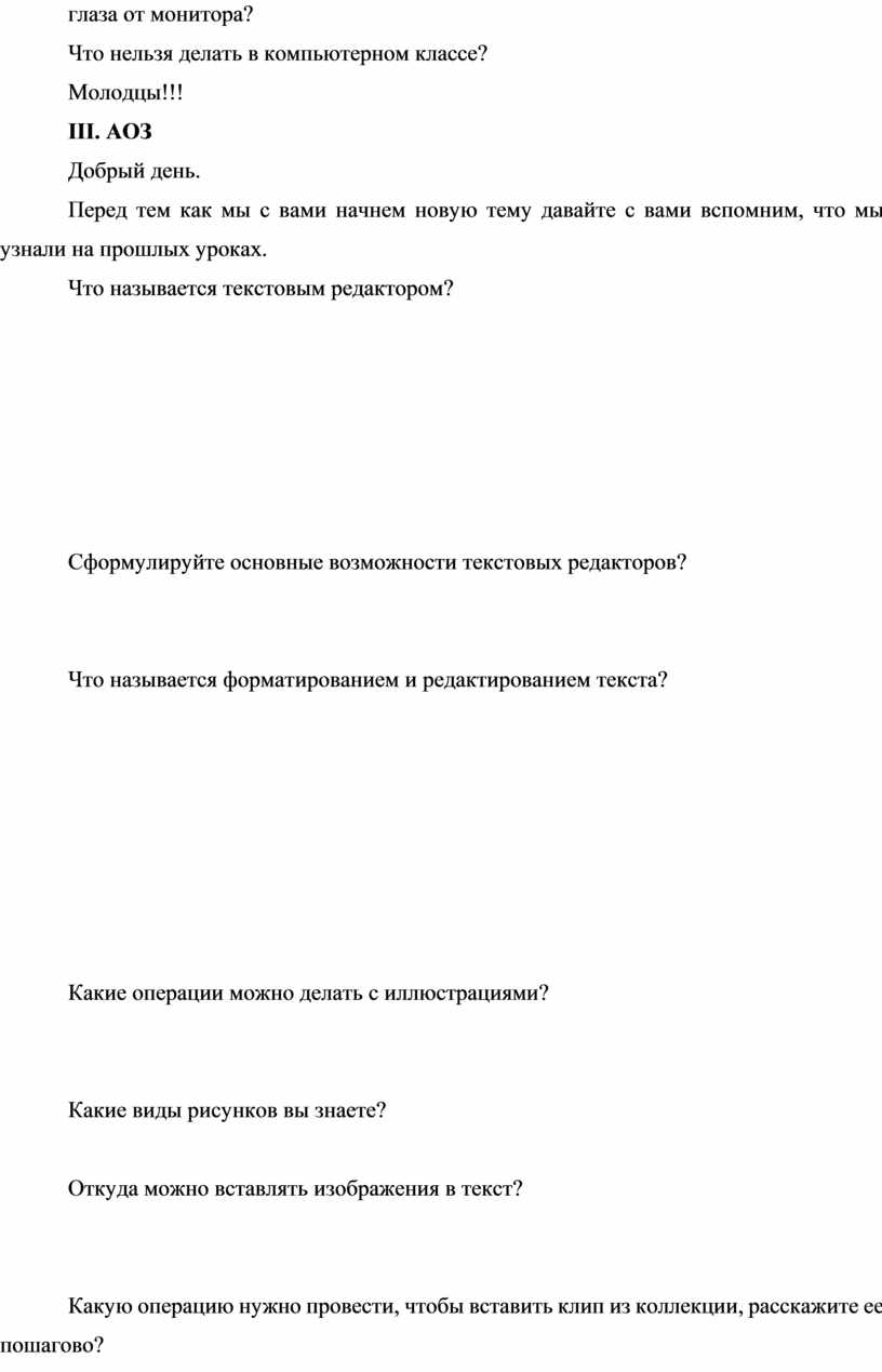 На каком расстоянии, должны находиться ваши глаза от монитора? Что нельзя делать в компьютерном классе? Молодцы!!! III. АОЗ Добрый день. Перед тем как мы с вами начнем новую тему давайте с вами вспомним, что мы узнали на прошлых уроках. Что называется текстовым редактором?