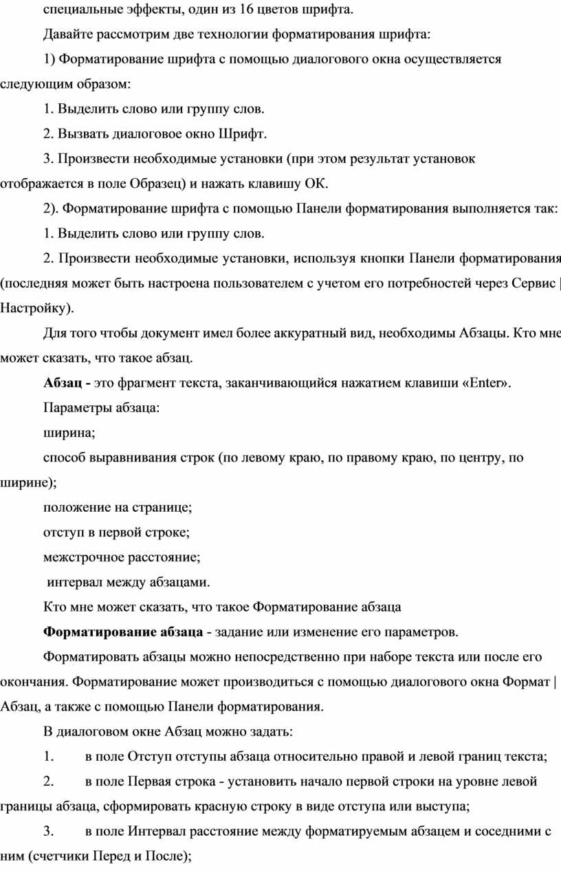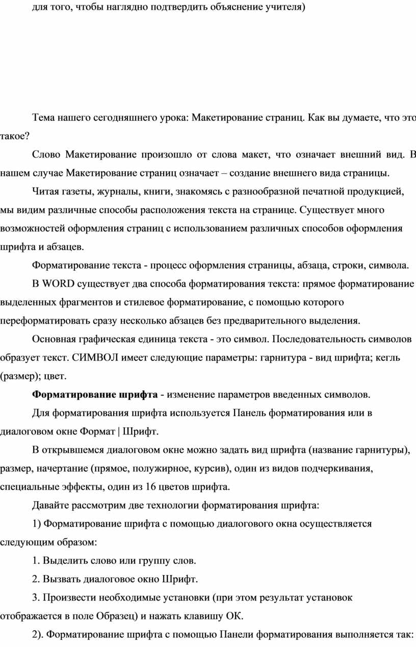 Тема нашего сегодняшнего урока: Макетирование страниц. Как вы думаете, что это такое? Слово Макетирование произошло от слова макет, что означает внешний вид. В нашем случае Макетирование страниц означает – создание внешнего вида страницы. Читая газеты, журналы, книги, знакомясь с разнообразной печатной продукцией, мы видим различные способы расположения текста на странице. Существует много возможностей оформления страниц с использованием различных способов оформления шрифта и абзацев. Форматирование текста - процесс оформления страницы, абзаца, строки, символа. В WORD существует два способа форматирования текста: прямое форматирование выделенных фрагментов и стилевое форматирование, с помощью которого переформатировать сразу несколько абзацев без предварительного выделения. Основная графическая единица текста - это символ. Последовательность символов образует текст. СИМВОЛ имеет следующие параметры: гарнитура - вид шрифта; кегль (размер); цвет. Форматирование шрифта - изменение параметров введенных символов. Для форматирования шрифта используется Панель форматирования или в диалоговом окне Формат | Шрифт. В открывшемся диалоговом окне можно задать вид шрифта (название гарнитуры), размер, начертание (прямое, полужирное, курсив), один из видов подчеркивания, специальные эффекты, один из 16 цветов шрифта. Давайте рассмотрим две технологии форматирования шрифта: 1) Форматирование шрифта с помощью диалогового окна осуществляется следующим образом: 1. Выделить слово или группу слов. 2. Вызвать диалоговое окно Шрифт. 3. Произвести необходимые установки (при этом результат установок отображается в поле Образец) и нажать клавишу ОК. 2). Форматирование шрифта с помощью Панели форматирования выполняется так: 1. Выделить слово или группу слов. 2. Произвести необходимые установки, используя кнопки Панели форматирования (последняя может быть настроена пользователем с учетом его потребностей через Сервис | Настройку). Для того чтобы документ имел более аккуратный вид, необходимы Абзацы. Кто мне может сказать, что такое абзац. Абзац - это фрагмент текста, заканчивающийся нажатием клавиши «Enter». Параметры абзаца: ширина; способ выравнивания строк (по левому краю, по правому краю, по центру, по ширине); положение на странице; отступ в первой строке; межстрочное расстояние; интервал между абзацами. Кто мне может сказать, что такое Форматирование абзаца Форматирование абзаца - задание или изменение его параметров. Форматировать абзацы можно непосредственно при наборе текста или после его окончания. Форматирование может производиться с помощью диалогового окна Формат | Абзац, а также с помощью Панели форматирования. В диалоговом окне Абзац можно задать: 1. в поле Отступ отступы абзаца относительно правой и левой границ текста; 2. в поле Первая строка - установить начало первой строки на уровне левой границы абзаца, сформировать красную строку в виде отступа или выступа; 3. в поле Интервал расстояние между форматируемым абзацем и соседними с ним (счетчики Перед и После); 4. в поле Межстрочный - расстояние между строчками абзаца (интерлиньяж); 5. в поле Выравнивание - один из 4 способов выравнивания - по левому краю, по правому краю, по ширине, по центру. Абзацы, на которые хотят обратить особое внимание, выделяют рамкой или затенением. Для этого исполь
