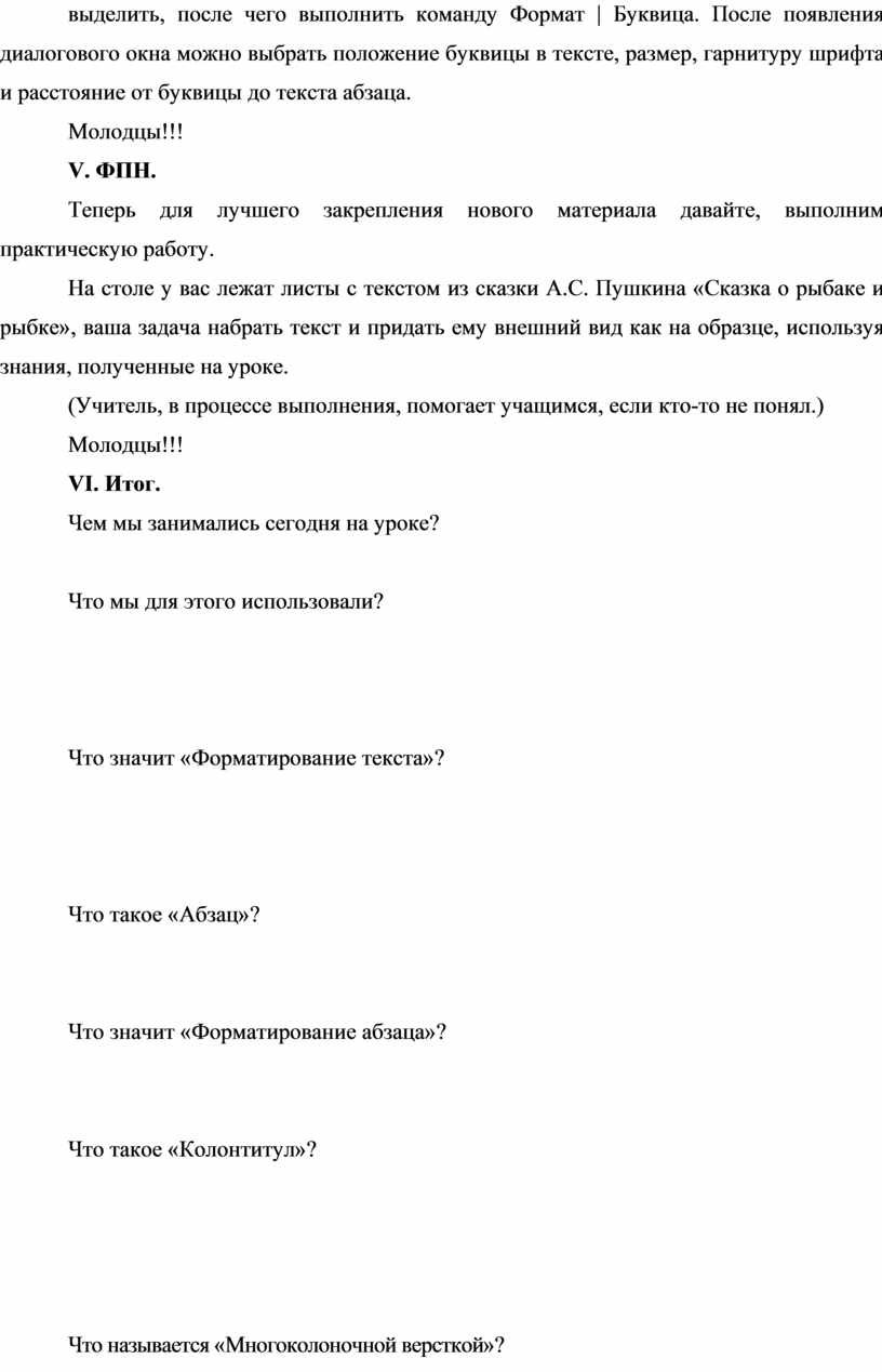 Многоколоночная верстка — расположение текста в несколько колонок. Определяя количество колонок, необходимо помнить, что от ширины колонки зависит размер шрифта. Чем меньше ширина колонки, тем шрифт должен быть мельче, и наоборот. А как вы думаете, что значит «Сверстать страницу». Сверстать страницу — значит расположить на странице в определенном порядке блоки текста, заголовки, иллюстрации, колонтитулы и другие элементы оформления. Для того чтобы выполнить разбивку текста на две или более колонок, надо использовать команду Формат | Колонки или кнопку Панели редактирования. В диалоговом окне можно определить количество колонок, их ширину, расстояние между колонками, наличие разделительной линии. Деление на колонки по умолчанию выполняется для всего документа. Для того чтобы разделить на колонки часть документа, надо либо выделить эту часть, либо вставить символы конца раздела, используя диалоговое окно Разрыв меню, Вставка. А кто мне может сказать, что такое «Буквица»? Буквица - это издательский термин, означающий увеличение в размере первой буквы первой строки. Для оформления буквы в виде буквицы ее нужно выделить, после чего выполнить команду Формат | Буквица. После появления диалогового окна можно выбрать положение буквицы в тексте, размер, гарнитуру шрифта и расстояние от буквицы до текста абзаца. Молодцы!!! V. ФПН. Теперь для лучшего закрепления нового материала давайте, выполним практическую работу. На столе у вас лежат листы с текстом из сказки А.С. Пушкина «Сказка о рыбаке и рыбке», ваша задача набрать текст и придать ему внешний вид как на образце, используя знания, полученные на уроке. (Учитель, в процессе выполнения, помогает учащимся, если кто-то не понял.) Молодцы!!! VI. Итог. Чем мы занимались сегодня на уроке?