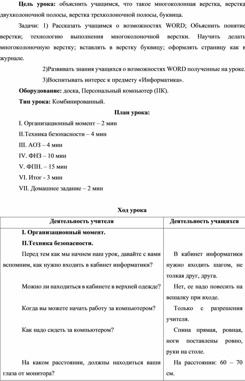 Задачи: 1) Рассказать учащимся о возможностях WORD; Объяснить понятие верстки; технологию выполнения многоколоночной верстки. Научить делать многоколоночную верстку; вставлять в верстку буквицу; оформлять страницу как в журнале.