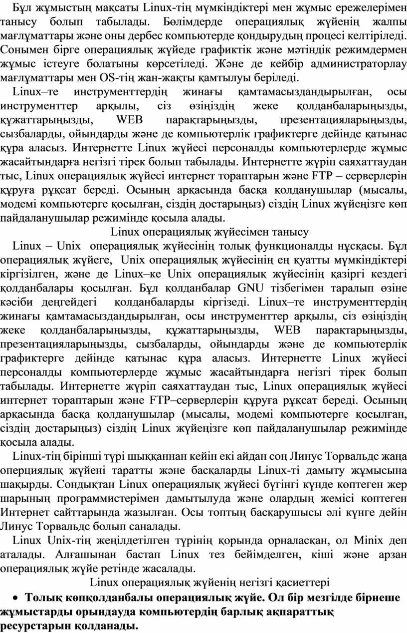Бұл жұмыстың мақсаты Linux-тің мүмкіндіктері мен жұмыс ережелерімен танысу болып табылады. Бөлімдерде операциялық жүйенің жалпы мағлұматтары және оны дербес компьютерде қондырудың процесі келтіріледі. Сонымен бірге операциялық жүйеде графиктік және мәтіндік режимдермен жұмыс істеуге болатыны көрсетіледі. Және де кейбір администраторлау мағлұматтары мен OS-тің жан-жақты қамтылуы беріледі.