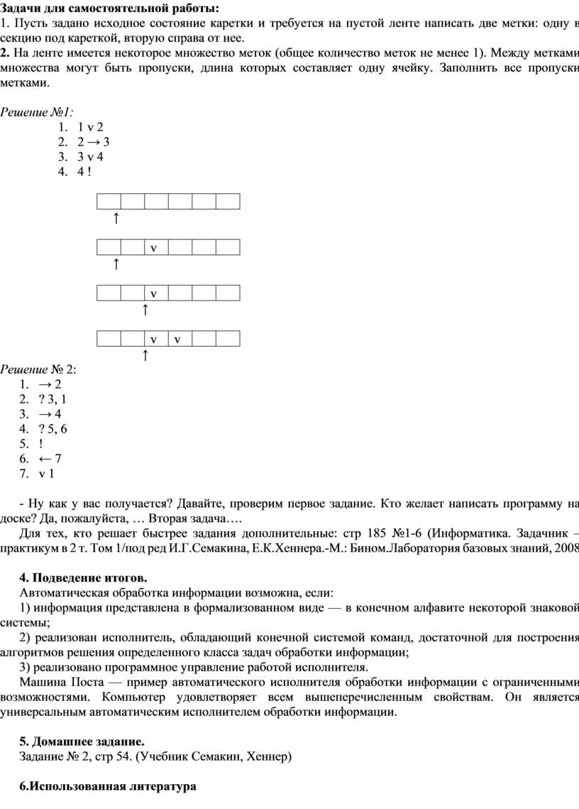Средства обучения: персональные компьютеры, имитатор машины Поста.