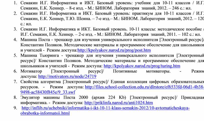 2. Семакин И.Г. Информатика и ИКТ. Базовый уровень: практикум для 10-11 классов / И.Г. Семакин, Е.К. Хеннер, Т.Ю. Шеина. – 7-е изд.– М.: БИНОМ. Лаборатория знаний, 2012. – 120 с.: ил.