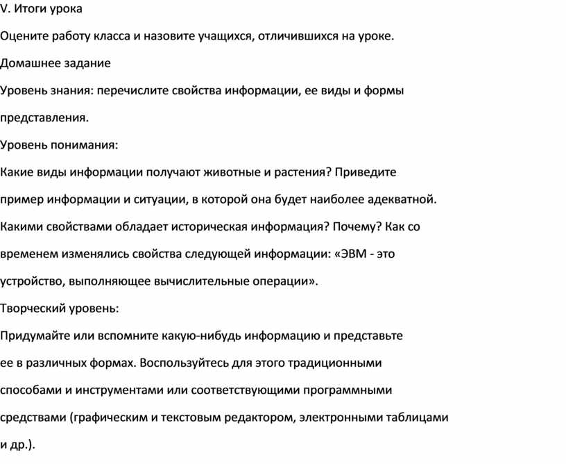 Уровень знания: перечислите свойства информации, ее виды и формы