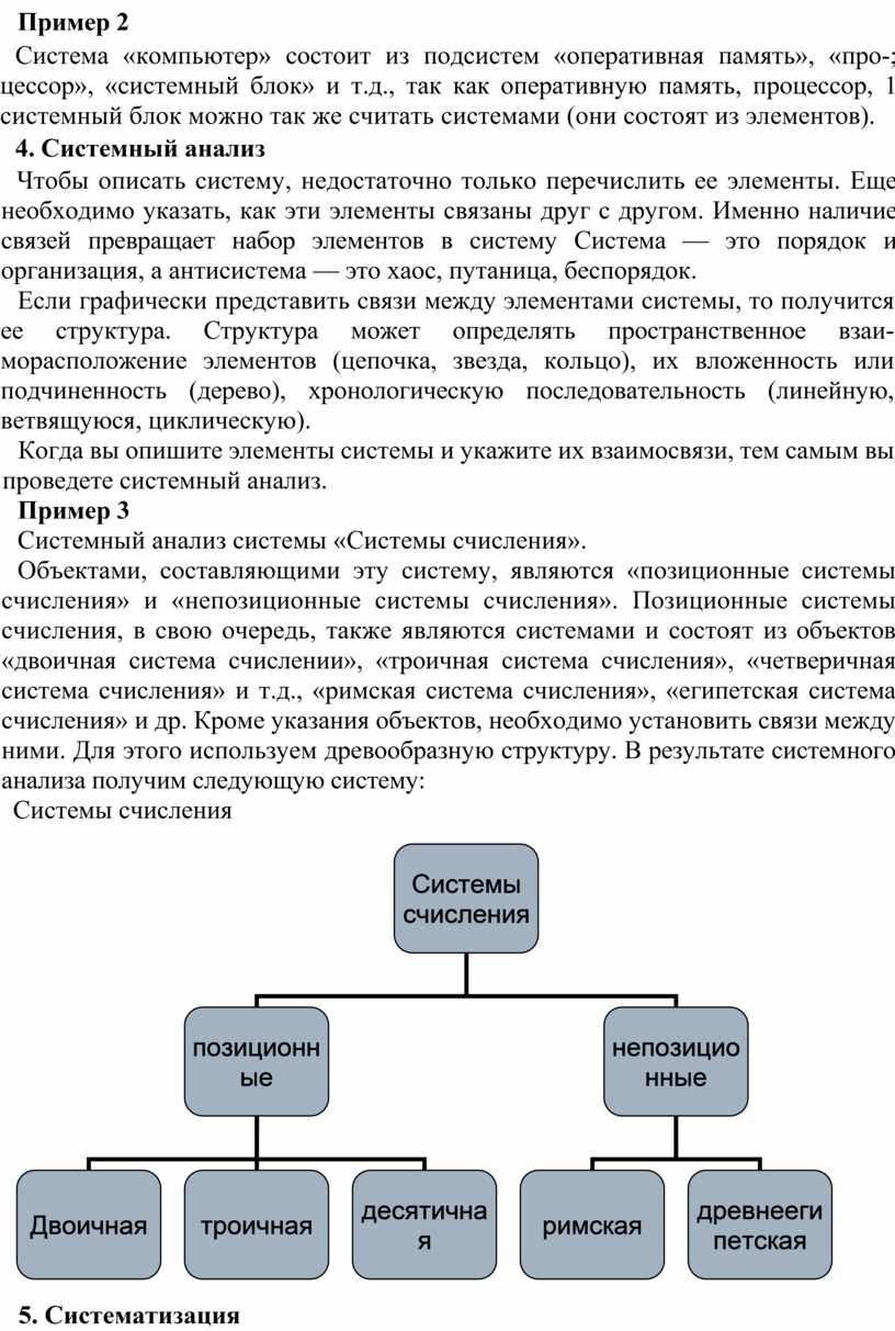Объектами, составляющими эту систему, являются «позиционные системы счисления» и «непозиционные системы счисления». Позиционные системы счисления, в свою очередь, также являются системами и состоят из объектов «двоичная система счислении», «троичная система счисления», «четверичная система счисления» и т.д., «римская система счисления», «египетская система счисления» и др. Кроме указания объектов, необходимо установить связи между ними. Для этого используем древообразную структуру. В результате системного анализа получим следующую систему: