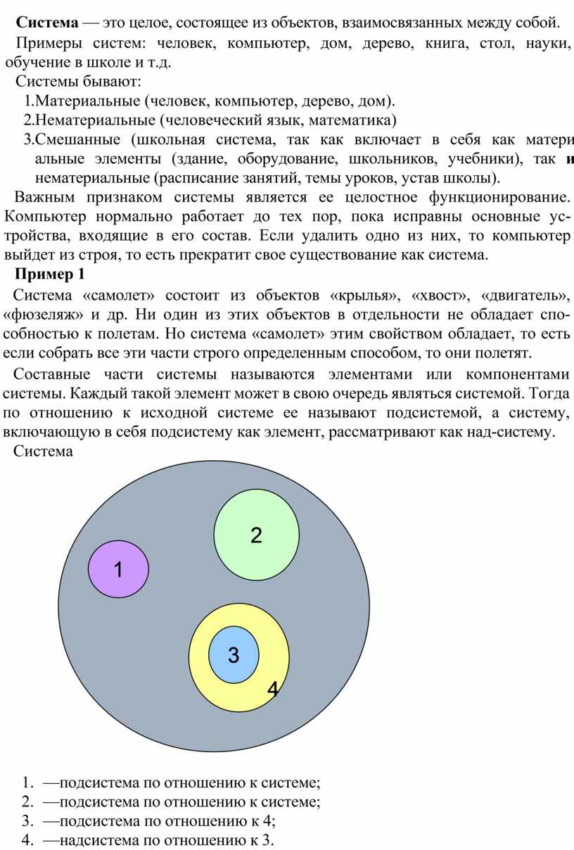 Примеры систем: человек, компьютер, дом, дерево, книга, стол, науки, обучение в школе и т.д.