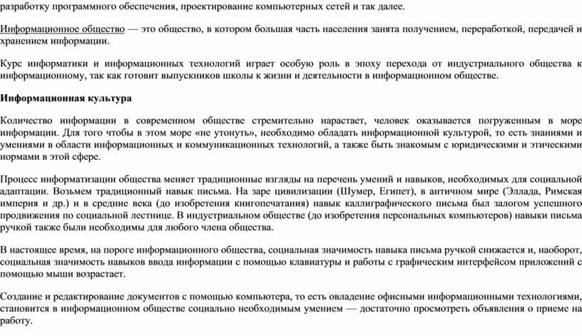 Создание и редактирование документов с помощью компьютера, то есть овладение офисными информационными технологиями, становится в информационном обществе социально необходимым умением — достаточно просмотреть объявления о приеме на работу.