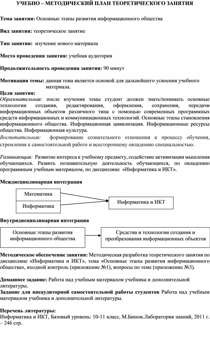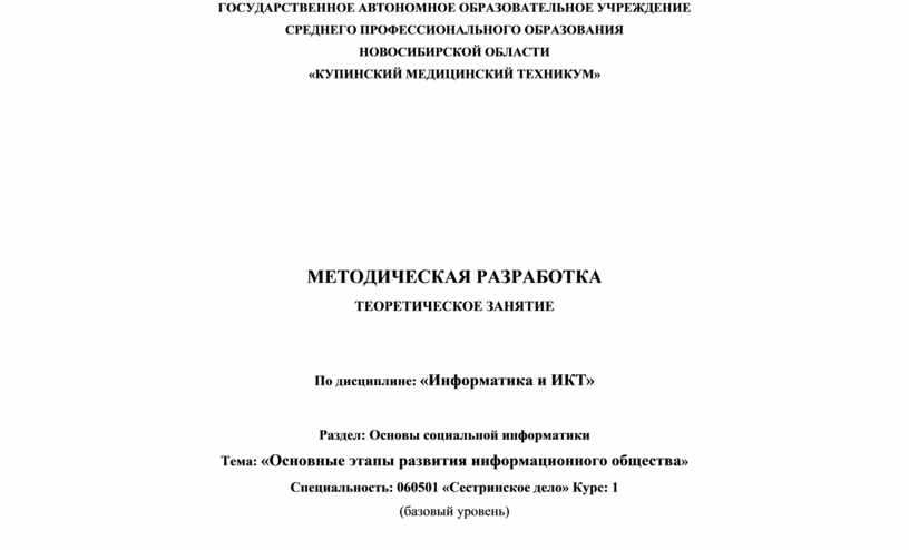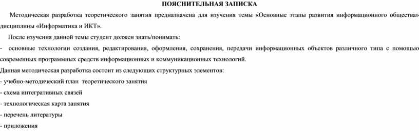 Методическая разработка теоретического занятия предназначена для изучения темы «Основные этапы развития информационного общества» дисциплины «Информатика и ИКТ».
