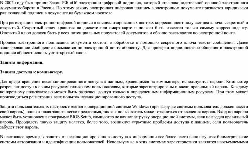 Для предотвращения несанкционированного доступа к данным, хранящимся на компьютере, используются пароли. Компьютер разрешает доступ к своим ресурсам только тем пользователям, которые зарегистрированы и ввели правильный пароль. Каждому конкретному пользователю может быть разрешен доступ только к определенным информационным ресурсам. При этом может производиться регистрация всех попыток несанкционированного доступа.