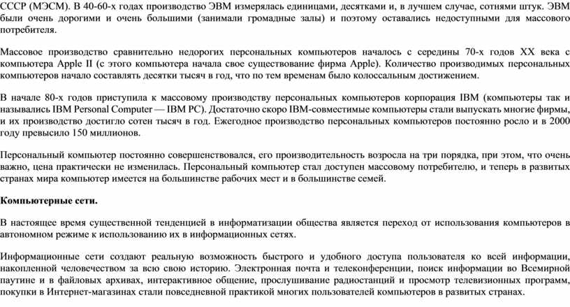 Первые электронно-вычислительные машины (ЭВМ), которые могли автоматически по заданной программе обрабатывать большие объемы информации, были созданы в 1946 году в США (ЭНИАК) и в 1950 году в СССР (МЭСМ). В 40-60-х годах производство ЭВМ измерялась единицами, десятками и, в лучшем случае, сотнями штук. ЭВМ были очень дорогими и очень большими (занимали громадные залы) и поэтому оставались недоступными для массового потребителя.