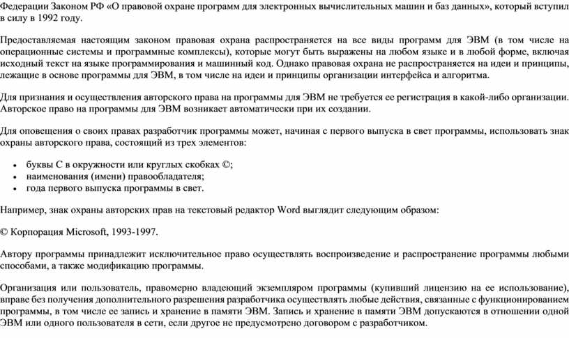Организация или пользователь, правомерно владеющий экземпляром программы (купивший лицензию на ее использование), вправе без получения дополнительного разрешения разработчика осуществлять любые действия, связанные с функционированием программы, в том числе ее запись и хранение в памяти ЭВМ. Запись и хранение в памяти ЭВМ допускаются в отношении одной ЭВМ или одного пользователя в сети, если другое не предусмотрено договором с разработчиком.