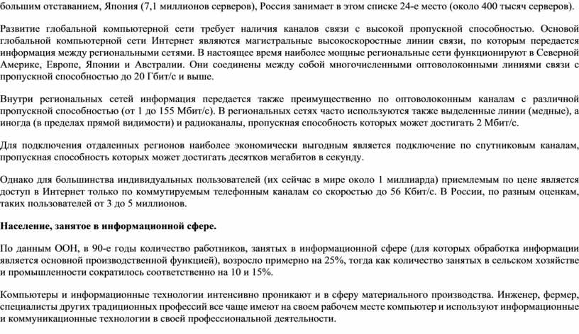 Развитие глобальной компьютерной сети требует наличия каналов связи с высокой пропускной способностью. Основой глобальной компьютерной сети Интернет являются магистральные высокоскоростные линии связи, по которым передается информация между региональными сетями. В настоящее время наиболее мощные региональные сети функционируют в Северной Америке, Европе, Японии и Австралии. Они соединены между собой многочисленными оптоволоконными линиями связи с пропускной способностью до 20 Гбит/с и выше.