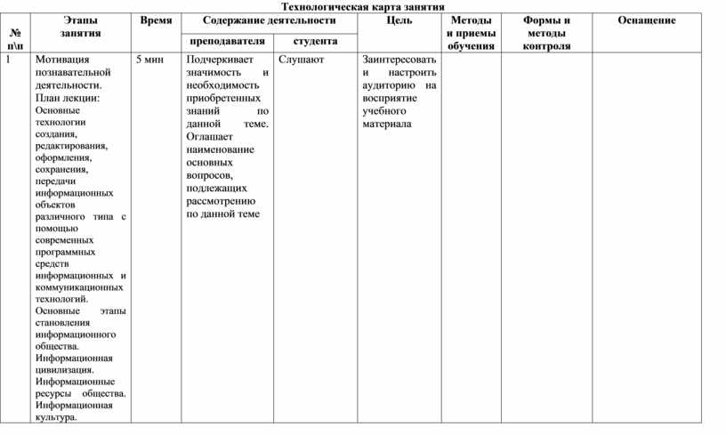 Технологическая карта занятия