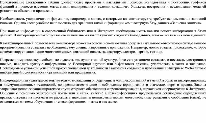 Информационная культура состоит не только в овладении определенным комплексом знаний и умений в области информационных и коммуникационных технологий, но предполагает знание и соблюдение юридических и этических норм и правил. Законы запрещают использование пиратского компьютерного обеспечения и пропаганду насилия, наркотиков и порнографии в Интернете. Общение с помощью электронной почты или в чатах, участие в телеконференциях предполагают соблюдение определенных правил: отвечать на письма и не рассылать знакомым и незнакомым людям многочисленные рекламные сообщения (спам), не отклоняться от темы обсуждения в телеконференциях и чатах и так далее.