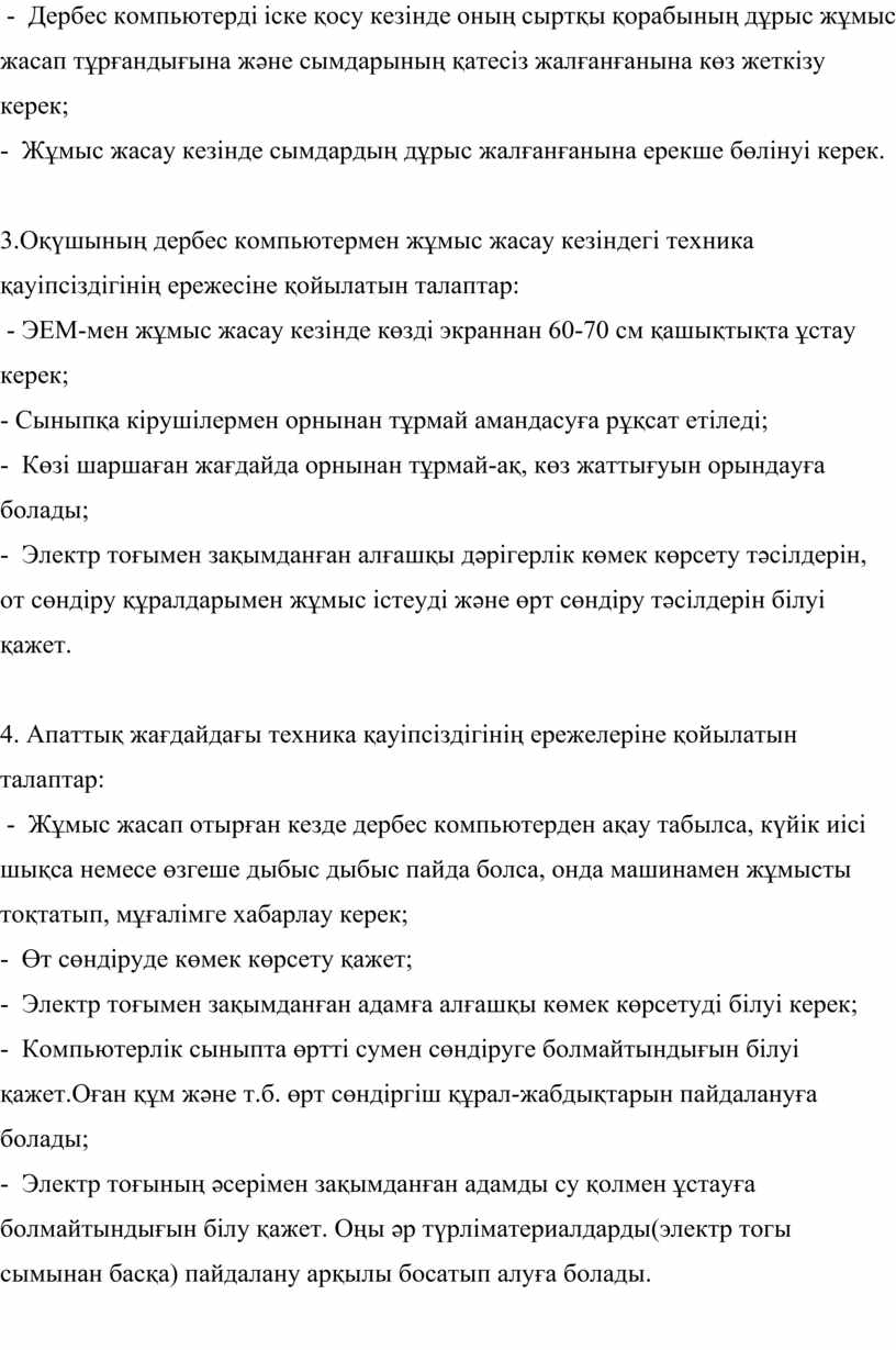 3.Оқүшының дербес компьютермен жұмыс жасау кезiндегi техника қауiпсiздiгiнiң ережесiне қойылатын талаптар:
